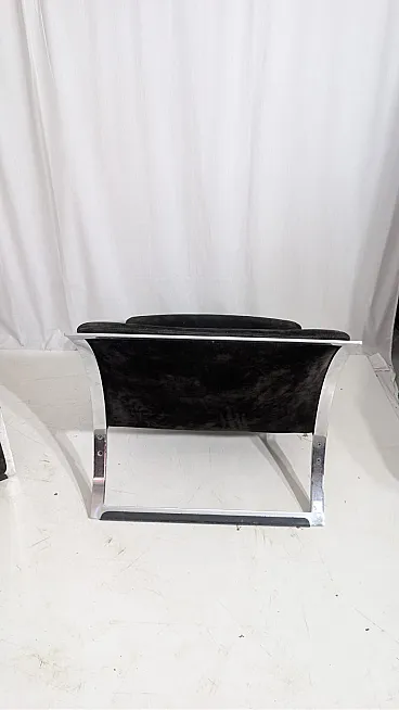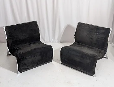 Elevate your interior with a striking pair of vintage lounge chairs that embody the quintessence of Italian modernist design. Created by the renowned designer Vittorio Introini for the legendary furniture firm Saporiti, this set dates from the 1960s and 1970s. Crafted with impeccable attention to detail, these elegant chairs feature a chrome steel structure that provides a sleek, reflective finish. The architecture of the frame is defined by simple, curved lines, creating a dynamic silhouette that is both sculptural and inviting. Upholstered in black Alcantara, the seats offer a soft texture and a sophisticated, uniform matte finish. Ideal for residential interiors and workspaces, this pair commands attention in a living room, creates a conversational grouping in a lobby, or adds a touch of intellectual decor to a creative office or studio. Their iconic presence enriches any space with a profound sense of history and style.