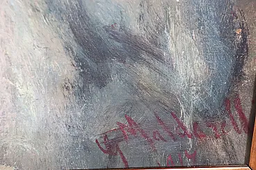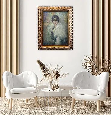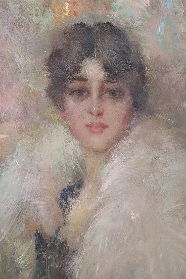 It is a fantastic painting in which the woman is portrayed in all her elegance, wearing a black evening dress and a showy white fur coat. A light smile and a bold look express the young woman's desire for fun and entertainment, despite the dating of the painting suggesting a difficult historical period, linked to the First World War. The pictorial quality is evident in a very personal style characterized by lively, material and rapid brushstrokes that perfectly capture the distinctive features of the woman. The painting is imbued with strength and immediacy, a vibrant painting that captures attention and pleasantly transports you into the thoughts of a young woman of the early 20th century.
