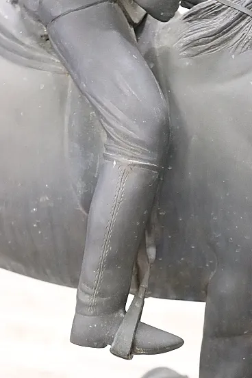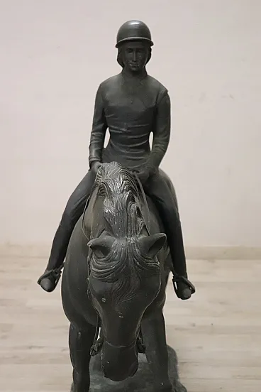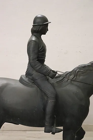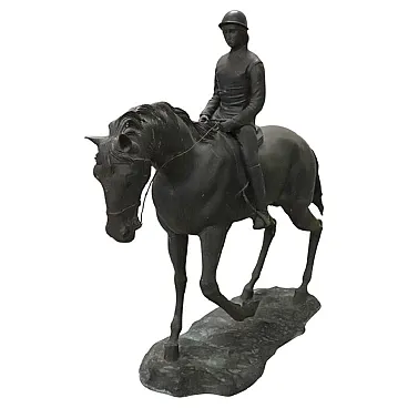 Both the jockey and the horse feature surprisingly lifelike detail; the jockey wears the typical racing outfit. The sculpture is highly dynamic: the horse is in movement, probably trotting or slow galloping, while the jockey, concentrated, follows the horse's pace. The sculpture rests on a bronze base that simulates a lawn or land, giving structure and aesthetically completing the work.