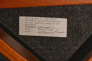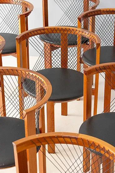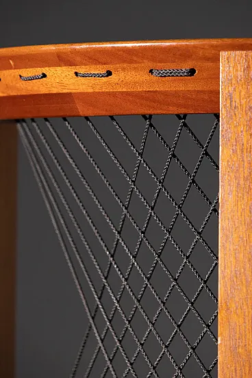 A rare and highly collectible set of eight “String” Chairs designed by Neils Jørgen Haugesen for Tranekær Furniture in the 1980s. These iconic chairs are celebrated for their architectural elegance, combining a sculptural solid-mahogany frame with a refined rhythm of stretched back cords a hallmark of Haugesen’s minimalist Danish design approach.