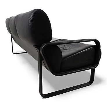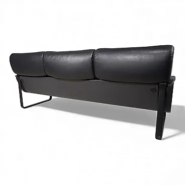 This Lobbytop three-seater leather sofa is upholstered in soft, high-quality leather and is in very good condition. The black, smooth leather shows a slight patina on the seat cushions. The solid metal frames, coated with a rubber-like plastic, are flawless and support a plastic tray into which the cushions are placed. The sofa offers excellent seating comfort.