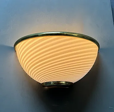 Set of 2 Murano Glass Lamps by Venini, 1970s This elegant pair of 1970s sconces showcases Venini's refined craftsmanship. Each sconce features hand-blown white Murano glass with a delicate swirl pattern, creating a soft, luminous effect when illuminated. The glass bowls are framed by polished brass rims and matching brass bases, adding a warm and sophisticated contrast. The wall lights each house two E14 bulbs and have been recently rewired, so they are ready for immediate installation. The sculptural half-cup shape and timeless materials make them ideal for contemporary and vintage interiors. Dimensions - Height: 18cm - Width: 30cm - Depth: 16cm Details - Set of 2 - Scrolled white Murano glass - Brass accents - Requires E14 bulbs - New wiring installed - Original 1970's Italian design A beautiful pair to add fine Italian design and mood lighting to any space.