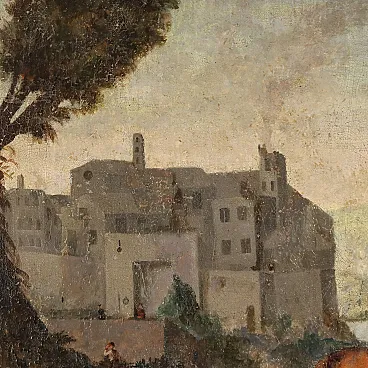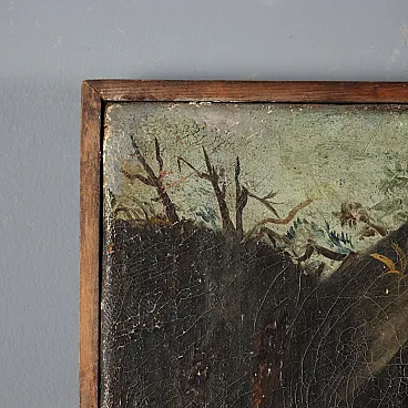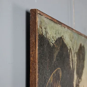 Oil on canvas. The Holy Family is depicted here with the infant Saint John and a crowned saint, likely Saint Catherine of Alexandria, the princess who was martyred on the wheel. Baby Jesus is tenderly reaching out to his Mother, who is lifting him from the cradle, while Joseph watches attentively behind them. The figures are set in a Nordic landscape. The canvas, already restored and relined in the mid-20th century, currently features several small paint losses.