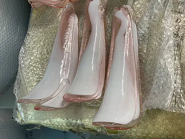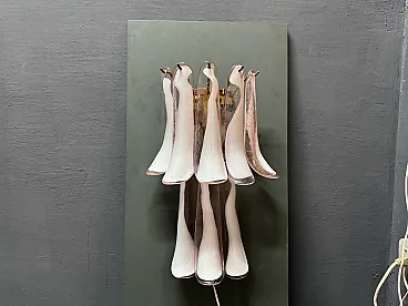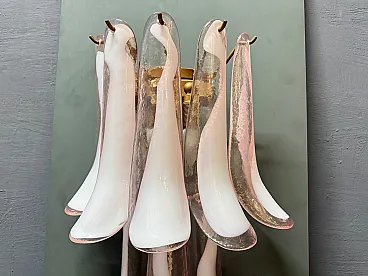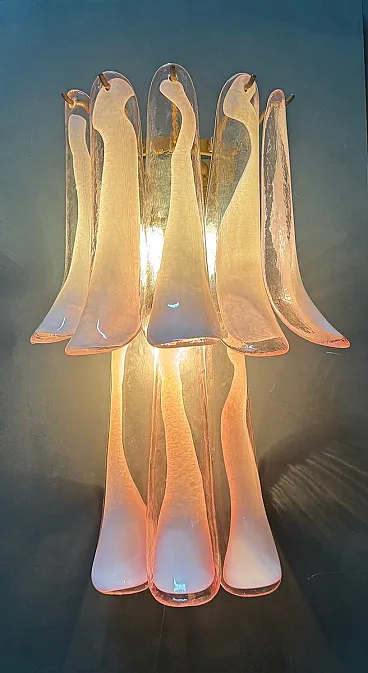 Large Murano Glass Feather Sconce, Set of 2 (1970s) These striking vintage sconces are made of hand-blown Murano glass and are composed of eight elongated glass "feathers" with a delicate shade of pink. The sculptural elements create a cascading shape that beautifully diffuses light, giving the pieces a refined and elegant presence. The sconces are mounted on brass hardware and equipped with updated wiring. Each fixture contains three E14 bulbs, providing warm, atmospheric lighting while preserving the original mid-century aesthetic. Dimensions - Height: 52cm - Width: 25cm - Depth: 18cm Details - Set of 2 - Original Murano craftsmanship from the 1970s - Eight glass feathers per sconce - Subtle pink shade of glass - Metal construction - Recently rewired - Requires E14 bulbs A stunning example of Italian glass art, these sconces make a stand-out addition to any modern or vintage-inspired interior.
