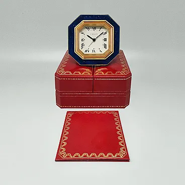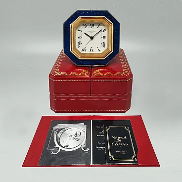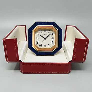 1980s Gorgeous Cartier alarm clock pendulette. Made in Swiss. It's lapis lazuli and golden metal with manual winding. Clock case numbered 7507 10267. With original case, lined with red leather and with instructions. It works perfeclty and is in excellent condition.