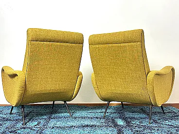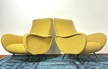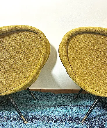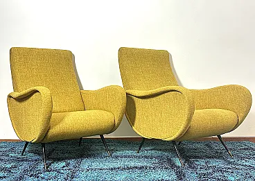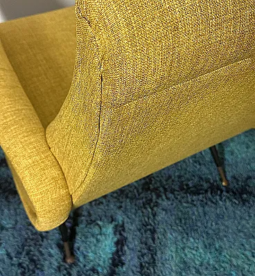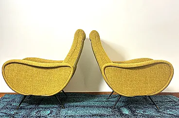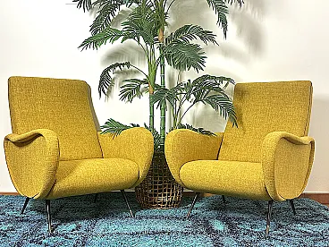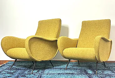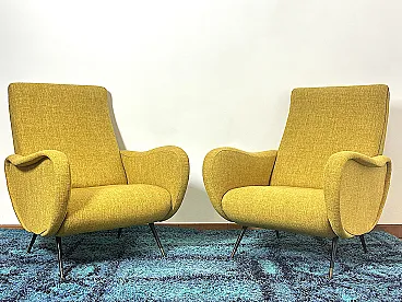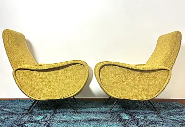 Pair of "LADY" Armchairs from the 1950s Design attributed to MARCO ZANUSO, a masterpiece of Made in Italy, Lady was awarded the Gold Medal at the IX Triennale of Milan in 1951. The armchairs are of Italian manufacture, completely restored with new upholstery and interiors, cotton fabric in the color Light Yellow, unmistakable style of the shell by the designer Marco ZANUSO, feet in metal and brass with the typical design of the 50s. PERFECT CONDITIONS Measurements Height 90 cm/Width 64 cm/Depth 90 cm/Seat height 40 cm/Seat 50 cm