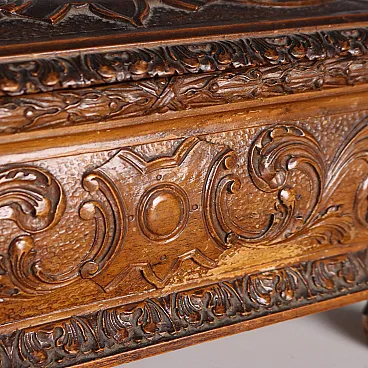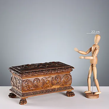 Walnut casket with moldings and carvings carved directly into the solid wood. Decorated with shields, leafy scrolls, and Greek frets. Feet shaped like wild beasts.