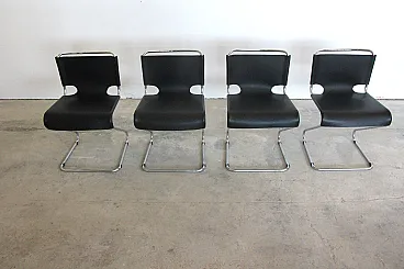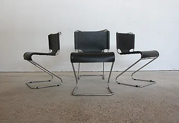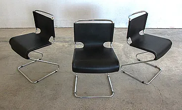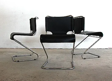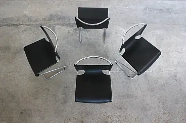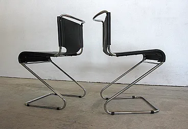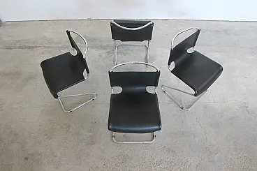 "Biscia" dining chair, designed by Pascal Morgue in the 1960s and produced by Steiner in France. Structure in chromed metal tubing, seat and back in thick and fine black leather, professionally repaired. They are extremely comfortable H 75 cm H seat 47 cm L 46 cm D ​5​0 cm