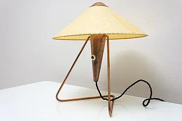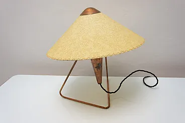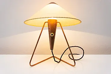 The lamp features a slender tripod brass structure supporting a characteristic conical lampshade, a form typical of Czech lighting design from the period. This model was produced in several minor structural variations, primarily differing in the base and socket holder, while the lampshade design remained consistent across versions.