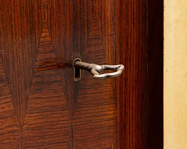 The side doors are inlaid with beautiful geometric rosewood motifs