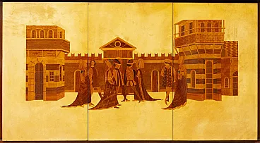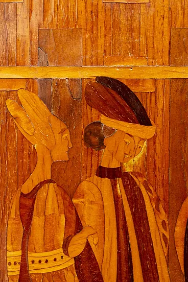 The central inlay represents a castle scene with court figures. The light background is in parchment