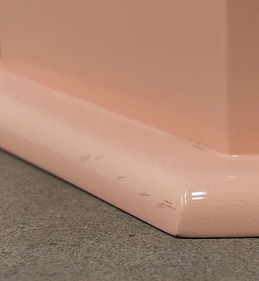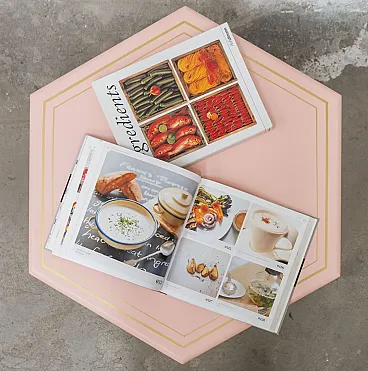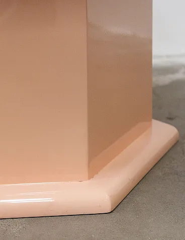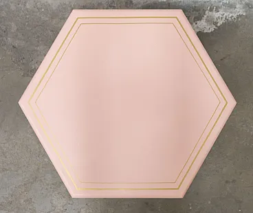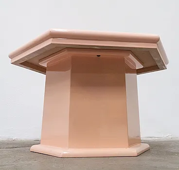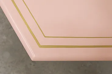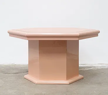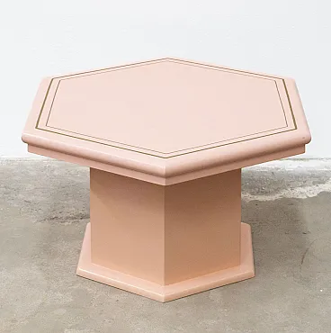 Rose-colored lacquered hexagonal coffee table Made of MDF, it has a shelf with a rounded edge and decorated in gold In very good condition, with normal signs of use