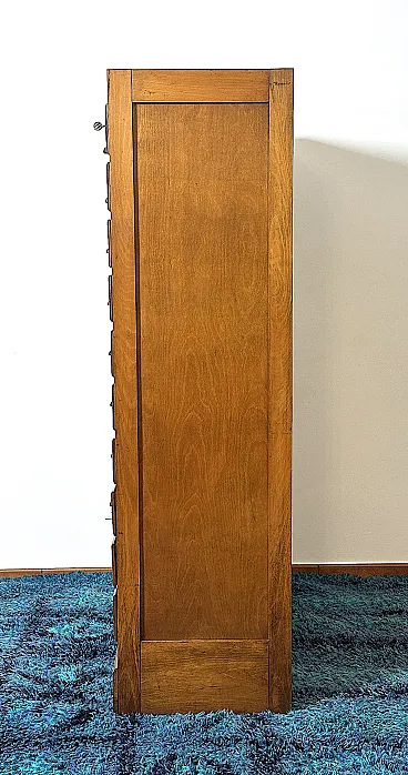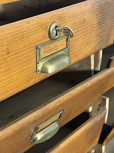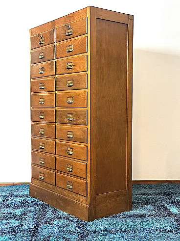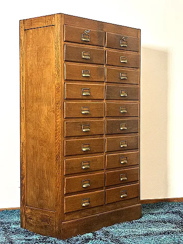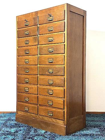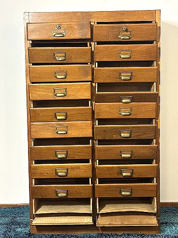 Vintage 1950s cabinet / chest of drawers MADE IN ITALY The cabinet is characterized by a solid structure in solid beech wood with a warm honey tone and a refined original patina. The cabinet is made up of 20 small-format drawers, arranged symmetrically, each equipped with a brass handle with integrated label holder. A functional and aesthetic detail that makes this piece extremely decorative and versatile. The two upper drawers are equipped with a lock and have a mechanism that allows you to close all the drawers simultaneously. The conditions are very good, with normal signs of aging consistent with age, which enhance its vintage character without compromising its functionality and stability. PERFECT CONDITIONS Measurements: Height 147 cm - Width 87 cm - Depth 40 cm