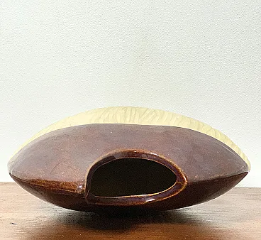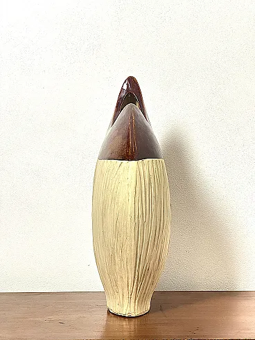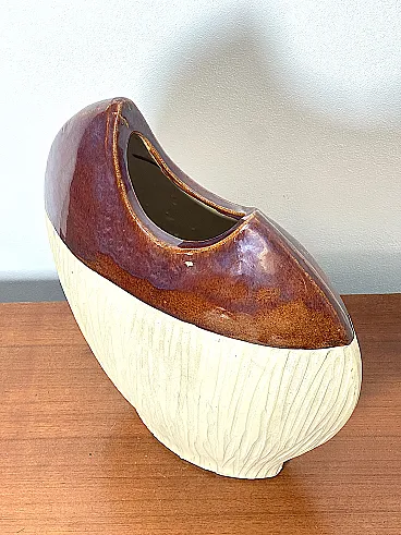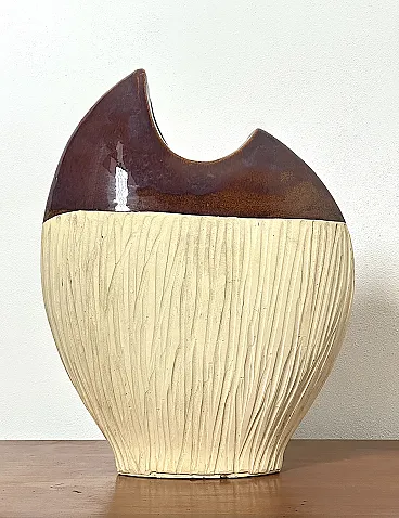 Sculptural ceramic vase from the 70s Made in Italy Vintage 70s vase in glazed ceramic, with a strong sculptural and material impact, perfect as a statement decorative element. The organic, soft and asymmetrical shape recalls the artistic language typical of ceramic design of the Seventies. The surface is divided into two parts: the lower section, opaque and textured, with vertical relief workmanship that enhances the materiality of the clay, the upper part, glazed and shiny, in a warm brown shade, which creates an elegant chromatic and tactile contrast. An object that functions both as a vase and as a decorative sculpture, ideal for mid-century, brutalist interiors, capable of communicating with wood, stone or metal furnishings. PERFECT CONDITIONS Measurements: Height 45 cm - Width 36 cm - Depth 13 cm