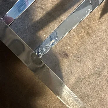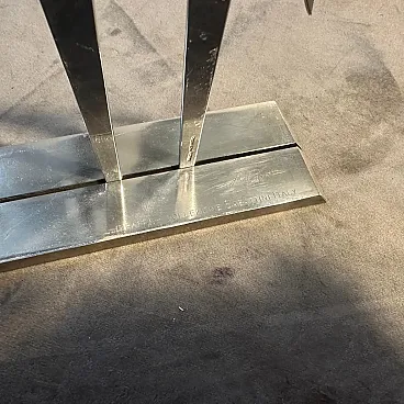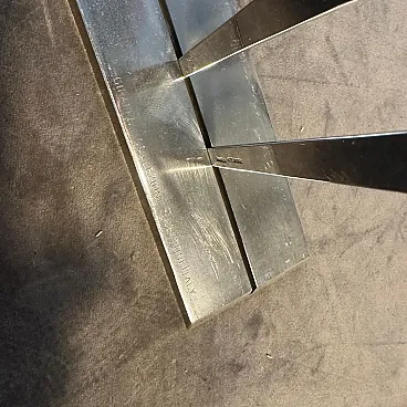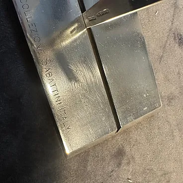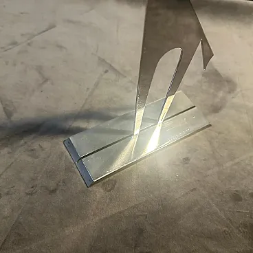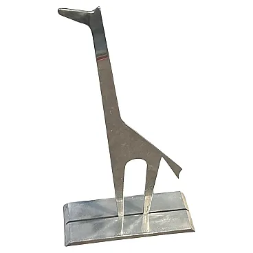 Vintage Minimalist Silver Plated Sculpture "La Giraffa" by Lino Sabattini (Circa 1990s) Presenting an exceptional piece of Italian design history, this striking Minimalist Sculpture, "La Giraffa" (The Giraffe), was designed by the master of modern metalware, Lino Sabattini, and produced by his own Collezione Sabattini atelier. This figurative yet abstract sculpture captures the graceful silhouette of a giraffe with extraordinary simplicity, embodying the pure, clean lines of Minimalist and Postmodern design from the late 20th century. The piece is crafted from a single, polished piece of silver plate over metal, giving it a bright, reflective finish that highlights its sleek, cutout form. The giraffe stands tall on a substantial rectangular base, clearly authenticated by the impressed cursive designer signature and the full manufacturer's mark: "Lino Sabattini Collezione Sabattini Italy." This collectible work is a bold and sophisticated decorative accent, perfect for discerning collectors of iconic Italian modernist design, adding a sculptural statement to any contemporary interior.
