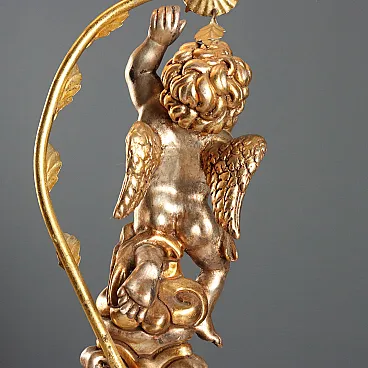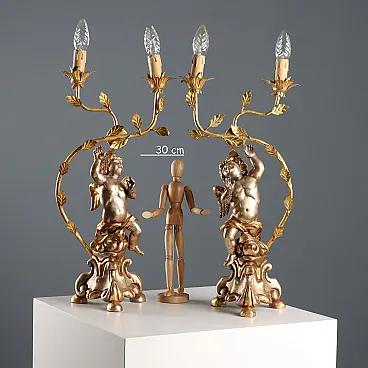 A pair of carved and gilded wooden candelabras. A cherub rests on a triangular base, holding a gilded iron torch holder with two flames shaped like a branch.
