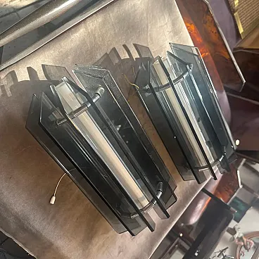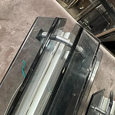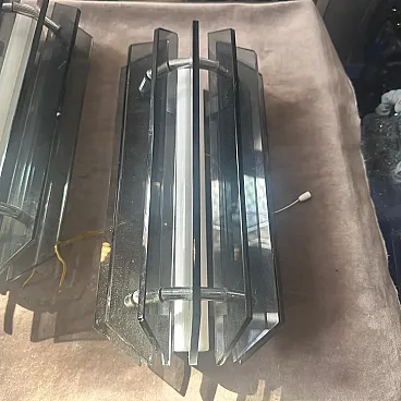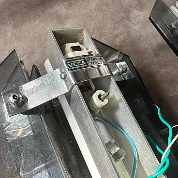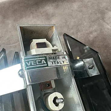 A striking pair of 1960s Space Age wall sconces, manufactured by the Italian lighting company Veca. These pieces perfectly embody the futuristic and geometric aesthetic of the Space Age design movement of the mid-to-late 20th century. Each sconce features a sharp, faceted, diamond-like shield constructed from thick, smoky gray and black tinted glass/acrylic panels. The panels are positioned to channel light, creating a dramatic, sculptural effect when illuminated. Housed within this outer structure is a central white tubular light source in perfect working order and a clean polished steel or aluminum frame, which is clearly stamped with the manufacturer's mark, "VECA MADE IN ITALY". This clear Italian provenance confirms their high-quality craftsmanship and period authenticity. When mounted, the sconces cast directional light up and down while allowing a subtle ambient glow to filter through the gray glass panels, making them an ideal, visually arresting addition to a modern hallway, entryway, or living space. This matched pair is in excellent vintage condition, ready to be installed and bring a piece of authentic Italian Space Age design into your home. They are in excellent condition.