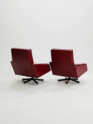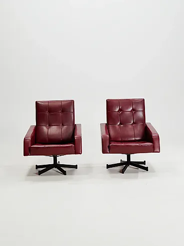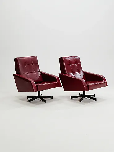 Mid-century modern red swivel armchairs with tufted upholstery, likely from the 1960s. This style is characterized by its clean lines, gentle curves, and functional design, which often includes a 360-degree swivel base. The specific manufacturer is difficult to determine without a tag or hallmark, as many companies produced similar designs during this era.