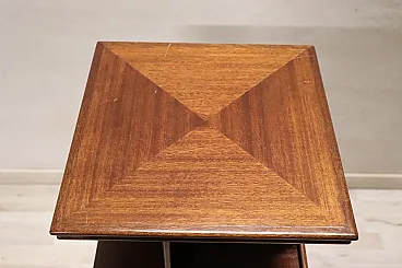 Made of mahogany wood veneer, it features modular shelves that extend vertically, offering a total of five levels. It has no signs of workmanship, but the quality of the material and the design are excellent. Its design is also inspired by similar pieces by famous Italian designer Gianfranco Frattini.