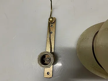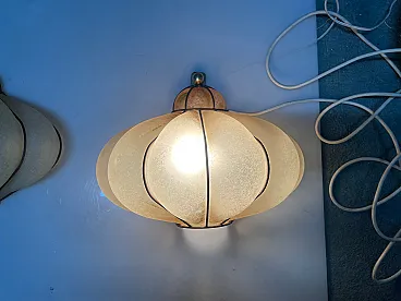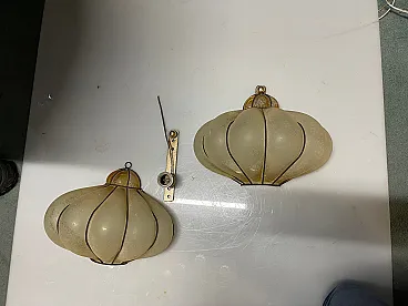 Italian Wrought Iron and Murano Glass Sconce, 1960s, Set of 2 Elegant 1960s Italian sconces with handcrafted Murano glass lampshades framed in sculptural wrought iron. The slightly frosted glass panels create a warm, diffused light, while the brass-colored knob and metal structure add a refined mid-century character. The organic, petal-like shape is typical of Murano glass design from this period, combining decorative art with functional lighting. These wall lights are perfect as accent lighting in living rooms, hallways, bedrooms or boutique interiors. Each piece has been professionally rewired and is ready to use. Details: • Origin: Italy • Period: 1960s • Materials: Murano glass, wrought iron, brass • Dimensions: • Height: 25cm • Width: 31cm • Depth: 25cm • Light source: 1 x E27 bulb per sconce • Condition: Good vintage condition with minor signs of age-related wear An elegant and timeless lighting set that gives any interior authentic mid-century Italian charm.