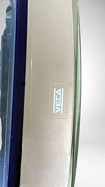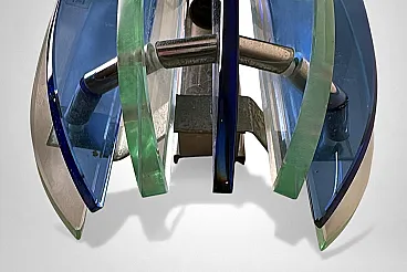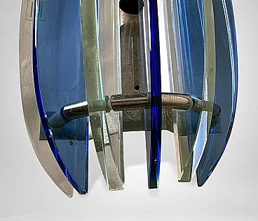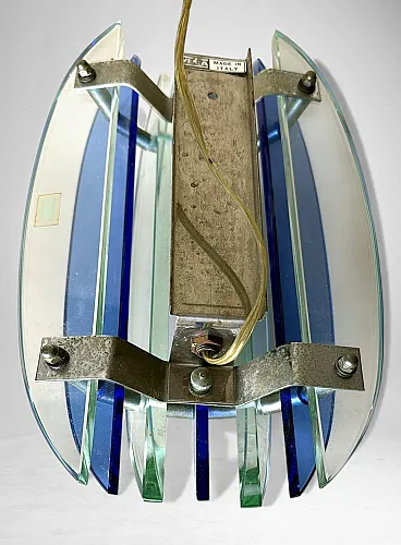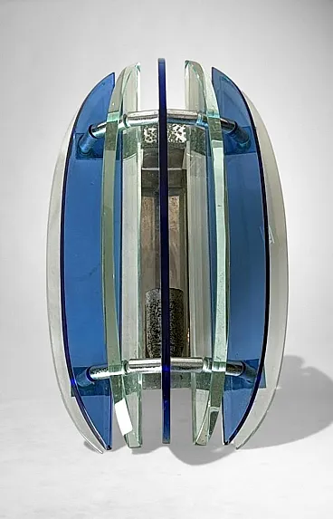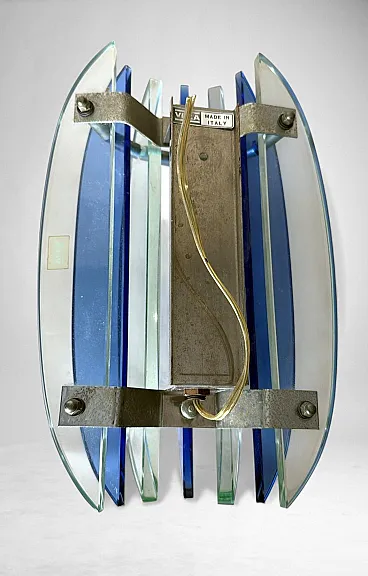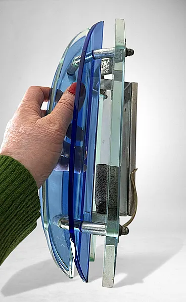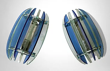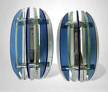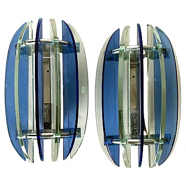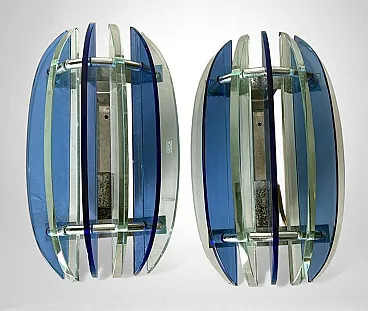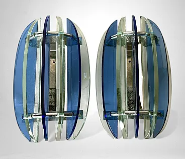 Elegant and streamlined pair of vintage Italian wall sconces in polished, nickel-plated brass. Each sconce features a solid metal frame with two shaped brackets at the ends, supporting seven crystal blades connected by slender curved tubes. The two brackets are joined by a rear plate that holds the single light socket; the electrical wiring also passes through this plate, allowing the sconces to be securely mounted on the wall. The seven crystal blades are finely contoured, alternating three blue elements with four clear ones, all extending outward like petals. The light filters beautifully through the crystals, producing refined and evenly diffused illumination. The sconces were manufactured between 1970 and 1973 by Veca (both original labels are still present) based on a design by Fontana Arte. Veca is a respected Italian company known for transforming crystal and plastic into functional design pieces. Fontana Arte, founded in Milan in 1932 by Luigi Fontana and Gio Ponti, is celebrated for its exceptional glass craftsmanship and its pioneering role in lighting design, standing as one of the most influential names in Italian design. With their clean lines, essential structure, and harmonious arrangement of the crystal elements, these sconces are elegant, modern accent pieces suitable for a wide range of interiors. They are in good overall condition, showing minor signs of oxidation on the sockets and nickel-plated structure. Dimensions: width 18 cm (7.08 in), depth 11 cm (4.33 in), height 28 cm (11.02 in).