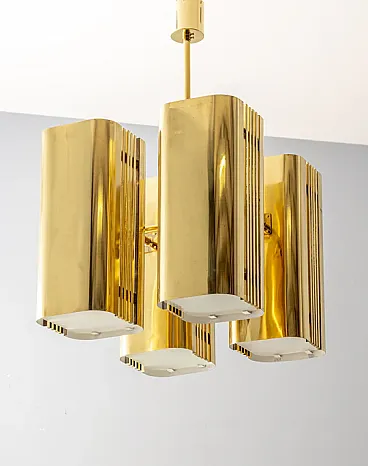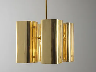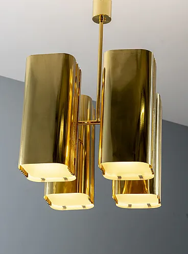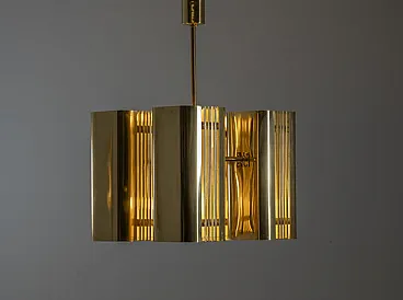 This brutalist chandelier dates to the 1970s and features a strong architectural composition defined by a geometric brass structure. The design is characterized by vertical brass slats arranged around the light sources, creating a pronounced play of light and shadow. The lower sections are complemented by frosted glass elements, which soften the light and introduce a refined contrast to the solid brass form.