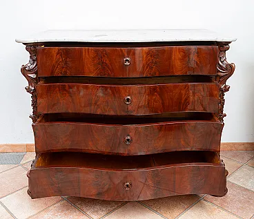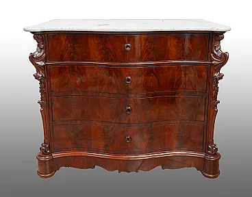 The curvilinear front is characterized by four drawers highlighted by circular wooden vents typical of the style to which they belong. The two corners are characterized by large volutes carved with a leaf motif ending on padded feet and connected to each other by a mixtilinear base. The top appears to be in white Carrara marble from the same period. Ps: Possibility of combining the pair of bedside tables. General Conditions: Restored by our master craftsmen with traditional shellac and handmade alcohol method. Provenance: Naples 19th century. Measurements: 130x65 H112cm. Document: Certificate of Authenticity.