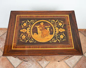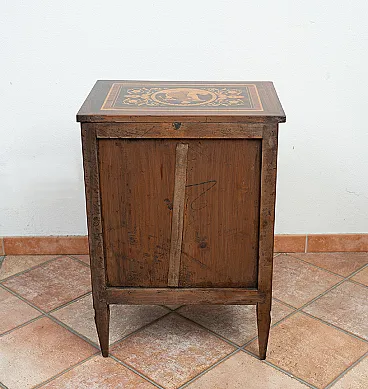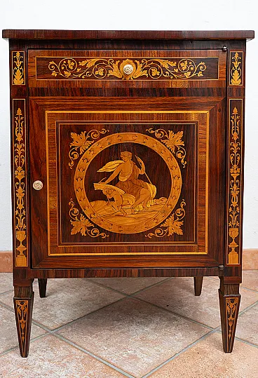 Description: Antique Louis XVI Lombard chest of drawers in precious exotic woods belonging to the second half of the 18th century. The piece of furniture has a rectangular shape set on four tapered truncated pyramidal legs typical of the neoclassical taste. The front features an upper drawer with floral inlay and spiral motifs centered by a small reserve in fine wood. The door below is decorated with a large inlaid circular medallion depicting a winged mythological figure in a natural landscape surrounded by geometric frames with plant motifs. The sides and the top are also inlaid with figurative scenes and floral decorations, a sign of high cabinet-making workmanship intended for a piece of furniture that is not only functional but also representative. General Condition: Restored by our master craftsmen with traditional shellac and handmade alcohol method. Provenance: Lombardy 18th century. Measurements: 55x39 H79cm. Document: Certificate of Authenticity.