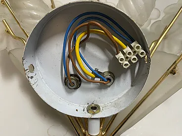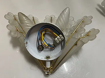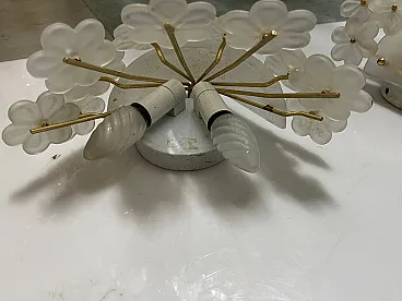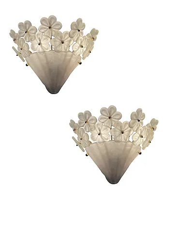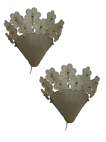 Pair of Murano glass sconces with flowers, Italy, 1960s Elegant pair of Italian sconces with handmade Murano glass flowers arranged in a bouquet-like composition. Each sconce is mounted on a brass frame with a white metal back plate, creating a refined contrast between the soft, translucent glass petals and the warm metallic structure. The floral elements are delicately fashioned, with gold centers adding a subtle decorative accent. The frosted glass diffuser has a fan shape and produces a warm, atmospheric light when illuminated. These sconces are ideal for adding a touch of mid-century Italian design to living rooms, bedrooms, hallways or boutique interiors. Details: • Origin: Italy • Material: Murano glass, brass, metal • Color: Clear/frosted glass with gold accents • Height: 25cm • Width: 29cm • Depth: 17cm • Condition: Excellent vintage condition • Wiring: Working • Sold as: Set of 2 A timeless decorative lighting set that combines craftsmanship, elegance and classic Italian style.