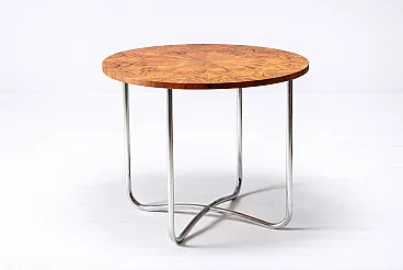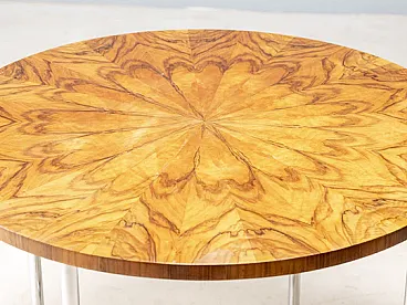 The table features a round veneered wooden top with a distinctive fan-shaped veneer pattern that creates a strong visual center. It is supported by an airy chrome-plated tubular steel base with dynamically intersecting legs, a construction that gives the table both stability and visual lightness.