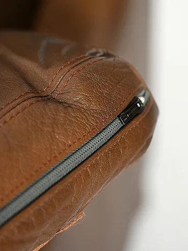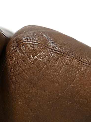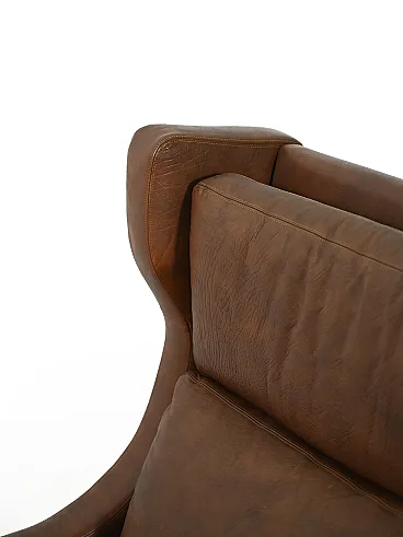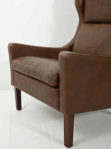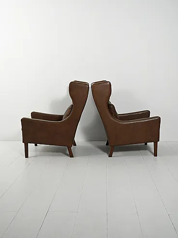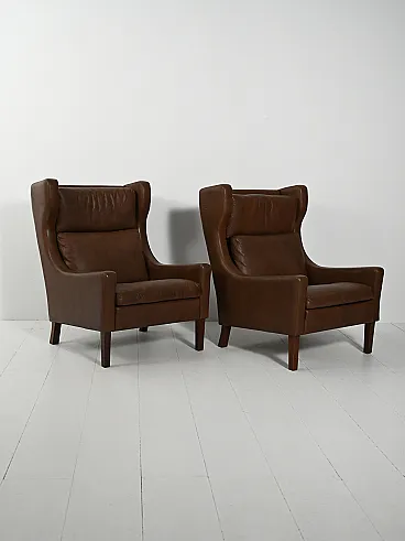 Pair of armchairs, probably Danish manufacture, 1950s, in dark brown leather, with high backrest and removable cushions.