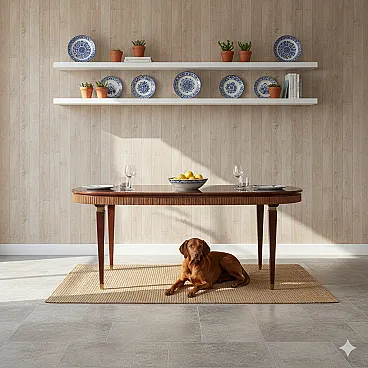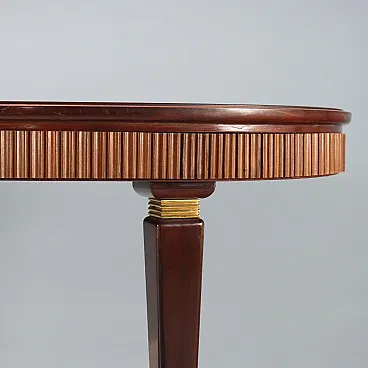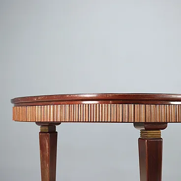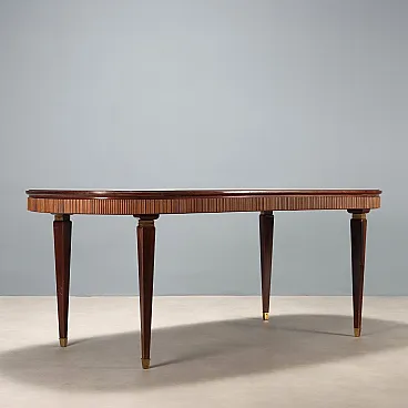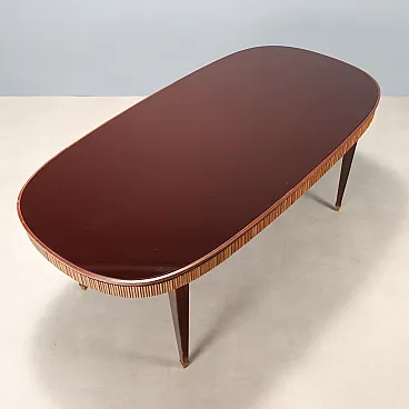 Elegant dining table with a classic line, made in Italy with an oval top in burgundy back-treated glass, a wavy wooden band, stained beech wood legs with brass inserts and tips.