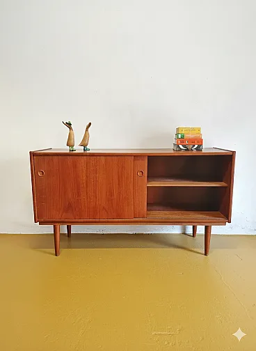 Vintage Danish 1950s sideboard in teak with sliding doors and drawers, with an essential and elegant design, perfect for functional and refined Scandinavian mid-century furnishings. This sophisticated Danish sideboard from the fifties with clean lines and compact dimensions, ideal for spaces that seek a complete organizational solution with the discreet elegance typical of quality Scandinavian furniture. The distinctive feature lies in the combination of sliding doors and drawers which offers organizational flexibility for different storage needs. The sliding doors allow practical access without the hassle of opening, while the drawers provide dedicated spaces for smaller items. The handles integrated into the wood create a clean line without protruding elements, characteristic of the Scandinavian design of the fifties.