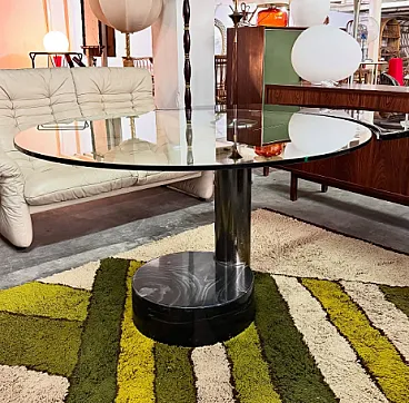Circular glass top, with an integrated extension system that allows you to increase the surface area while maintaining a clean and elegant line even when closed.