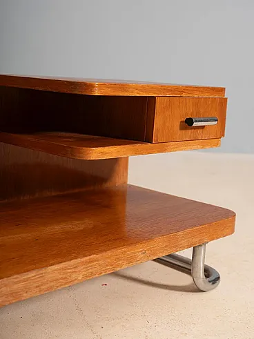 A refined functionalist hall stand with integrated mirror, shelf and drawer, produced in Czechoslovakia during the 1930s–1940s. The piece features a clean architectural composition combining warm wood veneer with chromed tubular steel legs, characteristic of Central European modernism.