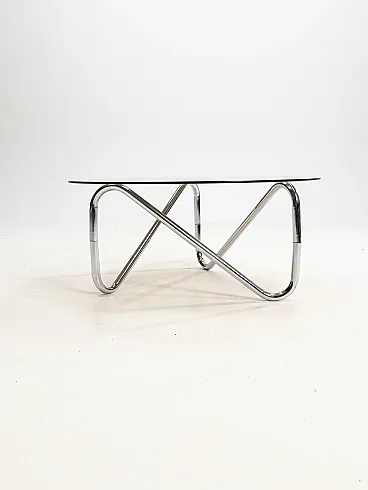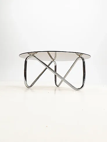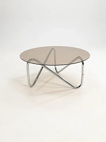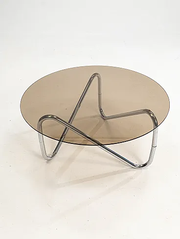 Materials: Round glass top (often tempered or smoked glass) and a sculptural base made of chromed tubular steel.
