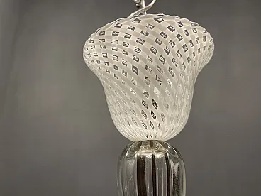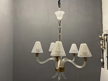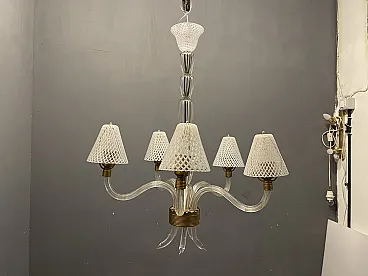 Rare Murano glass chandelier "Reticello" 1920s/40s Bronze Murano glass accessories Height 77cm Width 66cm Has 5 lights Requires E14 bulbs New wiring installed compatible with UK EUROPE USA. The technique used for this chandelier is one of the most famous, the "reticello". In Italian it literally means "a small network", and this is precisely the effect you see when observing this technique. This variant requires extreme patience and mastery. Just like the classic Murano filigree technique, reticello follows the same steps, only with two glass cores wrapped inside the glass rods.