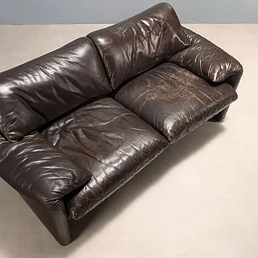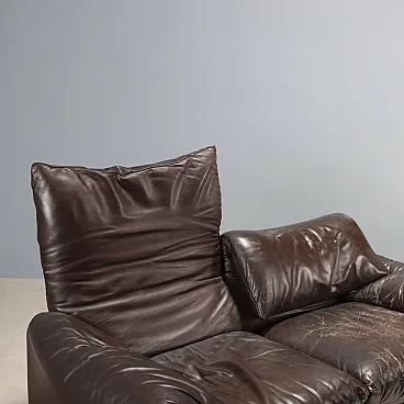 Two-seater sofa with foam padding and brown leather upholstery, featuring a fold-down backrest and headrest. The seat has obvious signs of wear and is suitable for upholstery renewal.