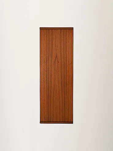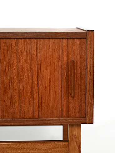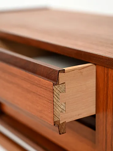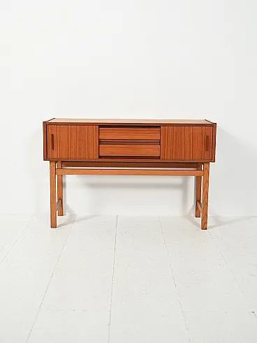 Scandinavian entrance cabinet dating back to the 1950s and 1960s, made of teak and oak. The composition alternates two storage compartments with sliding doors with a central row of small drawers, creating a refined balance between function and visual rhythm. The grain of the wood, played on vertical and horizontal directions, becomes a decorative element, while the structure raised on thin legs restores lightness to the whole. A simple and elegant example of mid-century Nordic design.