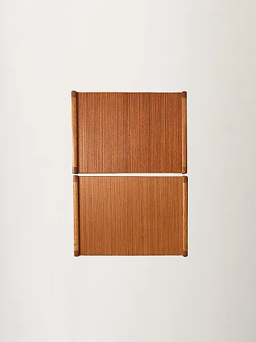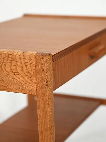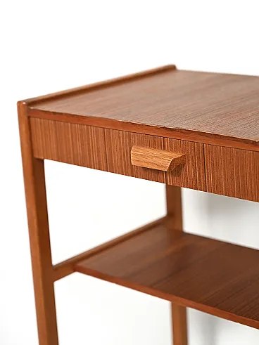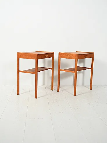 Pair of vintage Scandinavian bedside tables dating back to the 1960s, made of teak with a slender structure and balanced proportions. The top has a slight raised edge that discreetly defines the profile, while the straight and well-connected legs give visual lightness. The drawer is characterized by a sculpted wooden handle, with a soft and organic shape, almost crescent-shaped, a distinctive element of the project. The design is completed by the small magazine shelf integrated into the structure, functional and well harmonised. There are small visible signs of restoration in some places, consistent with the age of the object.