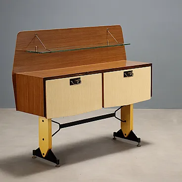 Vintage two-tone laminate cabinet with drop-down doors, wooden shelf and lacquered metal elements.