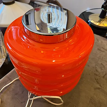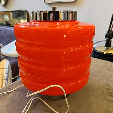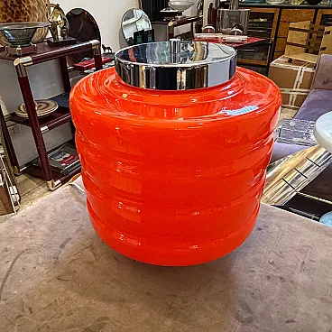 This striking Italian table lamp is a premier example of the 1990s revival of Space Age aesthetics, blending the futuristic optimism of the 1960s with the refined materials of late 20th-century European design. The piece features a high-shine chromed metal base and stem, offering a sleek, reflective surface that enhances the lamp's architectural silhouette and captures a modern, industrial-chic appeal. The centerpiece of the design is a vibrant, hand-blown orange glass shade, likely originating from the prestigious glassmaking traditions of Murano or renowned Italian manufacturers like AV Mazzega or Guzzini. This glass element is designed to diffuse light into a warm, atmospheric glow, transforming the bold pop-art orange into a soft, inviting radiance when illuminated. The combination of the cool, clinical chrome and the fiery, organic glass creates a dynamic visual tension that is quintessential to Italian "Techno-Space" lighting from this era. Perfectly preserved with its original wiring and components, this lamp serves as both a functional light source and a sculptural statement piece. Its clean geometric lines and play on spherical and cylindrical forms make it an ideal addition to interiors ranging from Mid-Century Modern to contemporary minimalist. This is a significant find for collectors of vintage Italian lighting, embodying a decade that masterfully reinterpreted cosmic inspiration for the sophisticated home. It has been never used, bought from a shop going out of business.
