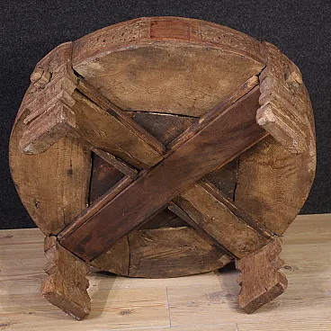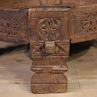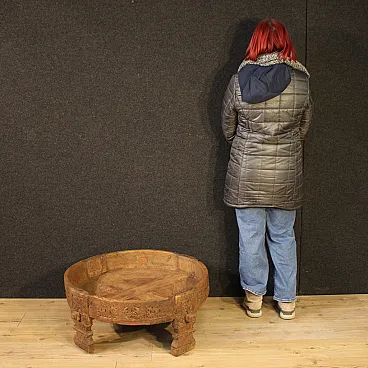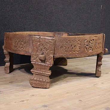 Indian coffee table from the first half of the 20th century. Richly sculpted and chiseled piece of furniture in exotic wood, with a pleasant decor. Small table hollowed out in the upper part which offers a compartment of excellent capacity. Mobile resting on four solid wooden legs also finely chiselled. Structurally sound and solid, furniture that can be easily positioned in different parts of the house, for antique dealers and interior designers. Can also be used as a planter, ideal piece of furniture for internal use. It shows some signs of restoration, overall in good condition and with a nice patina.