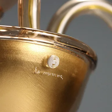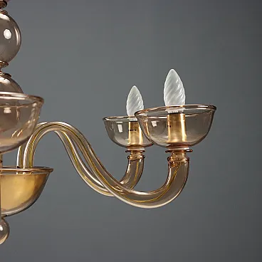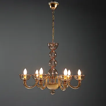 Venetian amber blown glass chandelier. Six lights supported by curved arms. Murano, mid-20th century.