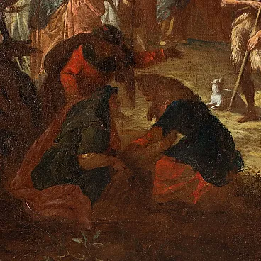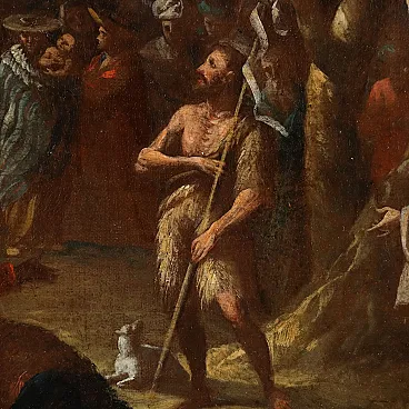 Oil painting on canvas. Flemish school of the 17th-18th centuries. The large scene takes place in a vast Nordic landscape, within a forest full of twisted plants, and on the right a city surmounted by rocky peaks. Inside the woods a large group of figures, popular but also high-ranking figures, all in oriental clothes, who form a circle around John the Baptist, portrayed in his traditional iconographic costume (dressed in skins, with the staff surmounted by the Cross and wrapped in the scroll, a little lamb at his feet): John\'s gaze is turned upwards, in line with a bird flying above the treetops, a symbolic representation of the Holy Spirit who inspires the preacher's words. Restored and relined, the painting is presented in a late 19th - early 20th century frame.