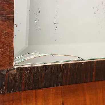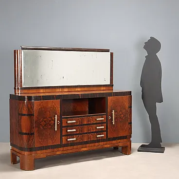 Art Deco cabinet with hinged doors, open compartment, and three drawers. It features a burl veneer with exotic wood inserts and metal handles. In good overall condition, with a small crack in the mirror, as shown in the photo.