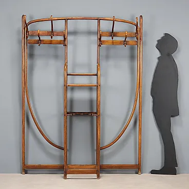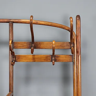 Thonet wall coat stand in bent beech, stained walnut. Eight coat hooks on top, five umbrella stands in the lower central compartment. The central mirror is missing. Vienna, early 20th century.