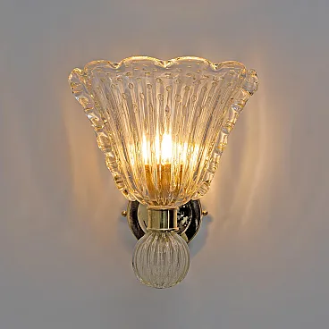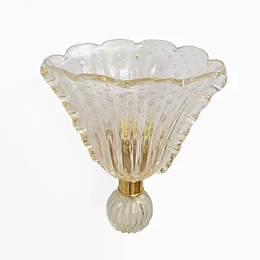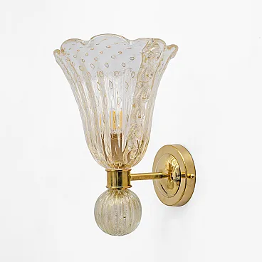 This fabulous pair of Art Deco-style Murano glass sconces is entirely handcrafted. They are decorated entirely using the Pulegoso technique, which features large air bubbles within the high-quality blown glass, embellished with 24-karat gold dust. The edges are beautifully scalloped. They rest on an elegant textured brass stand. They are highly decorative and can be used in any setting. Their light is warm and very pleasant, complementing many interior styles and adding a touch of elegance. A bulb with an E14 base is required for the United States, or an E12 for Europe. They operate at 110 or 220 volts. Other pairs are available; please inquire about availability. We also sell in odd quantities; contact us for a quote. Additionally, upon request, our glassworks can produce larger quantities to meet your specific needs. The back plate measures 11 cm in diameter.