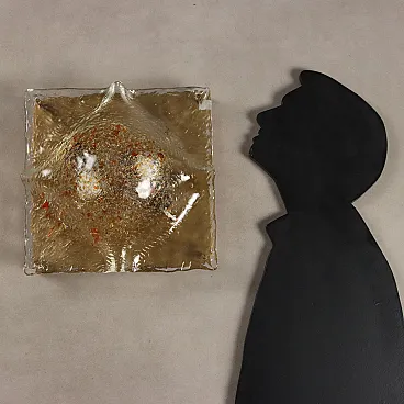 Vintage ceiling lamp with metal frame and transparent curved and worked glass diffuser with orange decorations. Good condition.