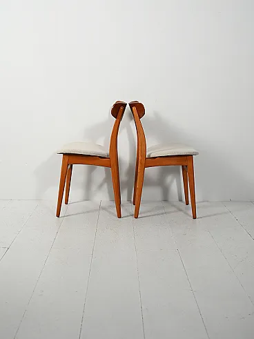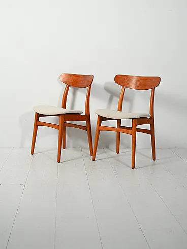 Pair of 1960s Scandinavian chairs in teak, with elegantly curved crescent-shaped backrest that recalls the famous "CH30" model by Hans Wegner. The lines are clean and essential, enhanced by visible interlocking dowels and very accurate finishes, typical of the best Nordic cabinet-making of the period. Slender structure with tapered legs and well-proportioned crosspieces; seats reupholstered in beige washable fabric.